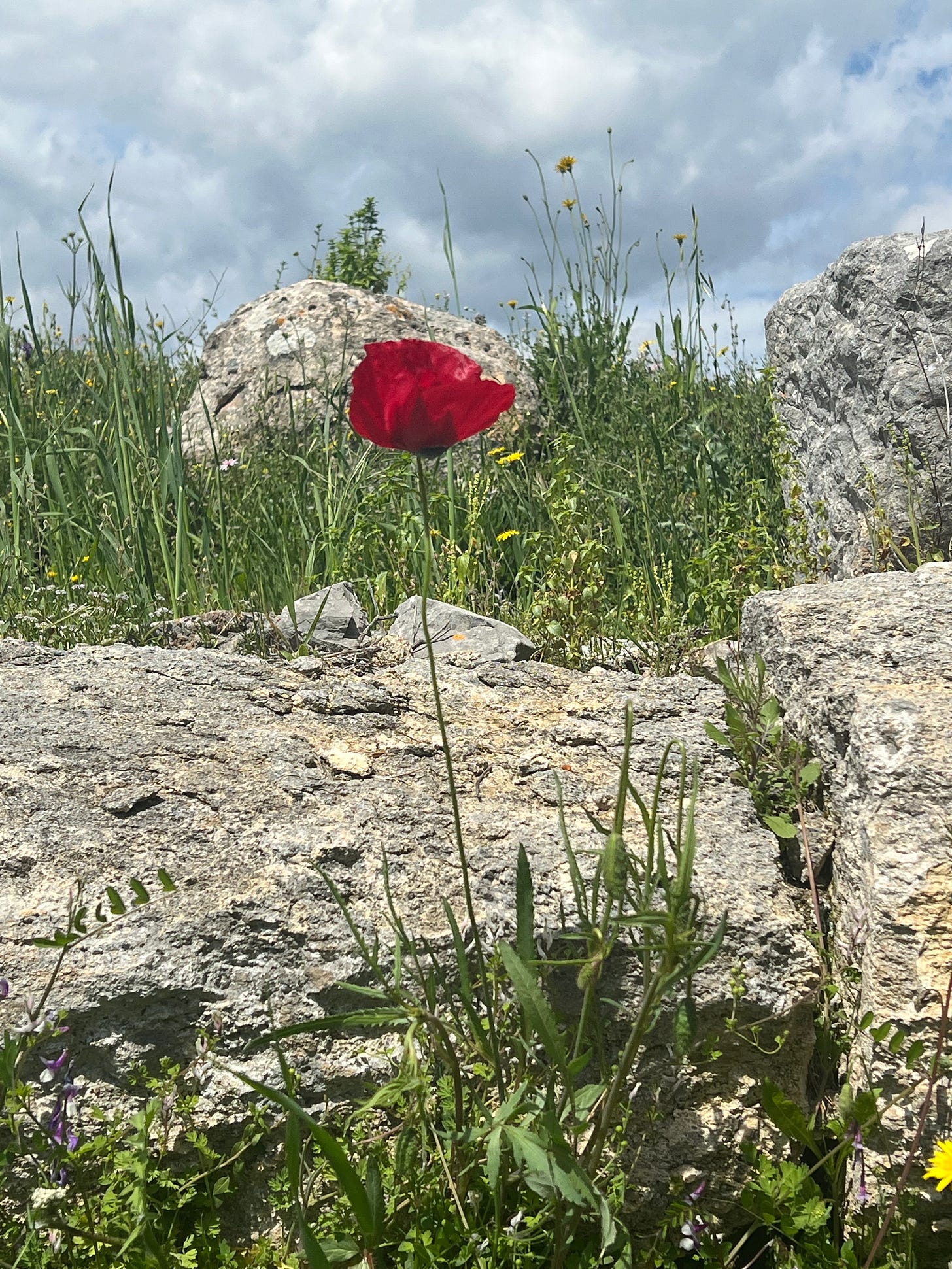 Here on the island, as spring quickens into fullness, the fields and hillsides have turned red with wild poppies—paparounes—flaring open like small fires from the earth. Their fragile petals tremble in the breeze, ephemeral yet unmissable, arriving each year as heralds of renewal.